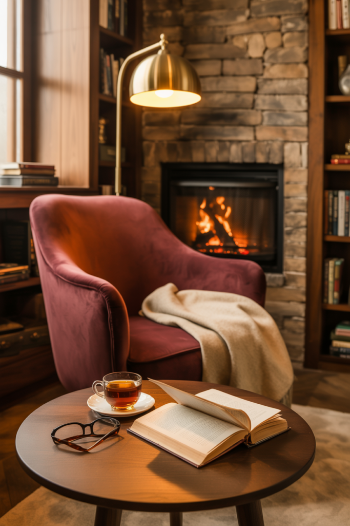 A corner fireplace can be the perfect spot to create a cozy reading nook. Adding a comfortable chair, a floor lamp, and a side table can make the space feel inviting and relaxing.