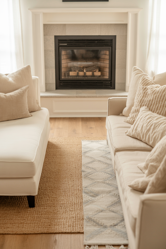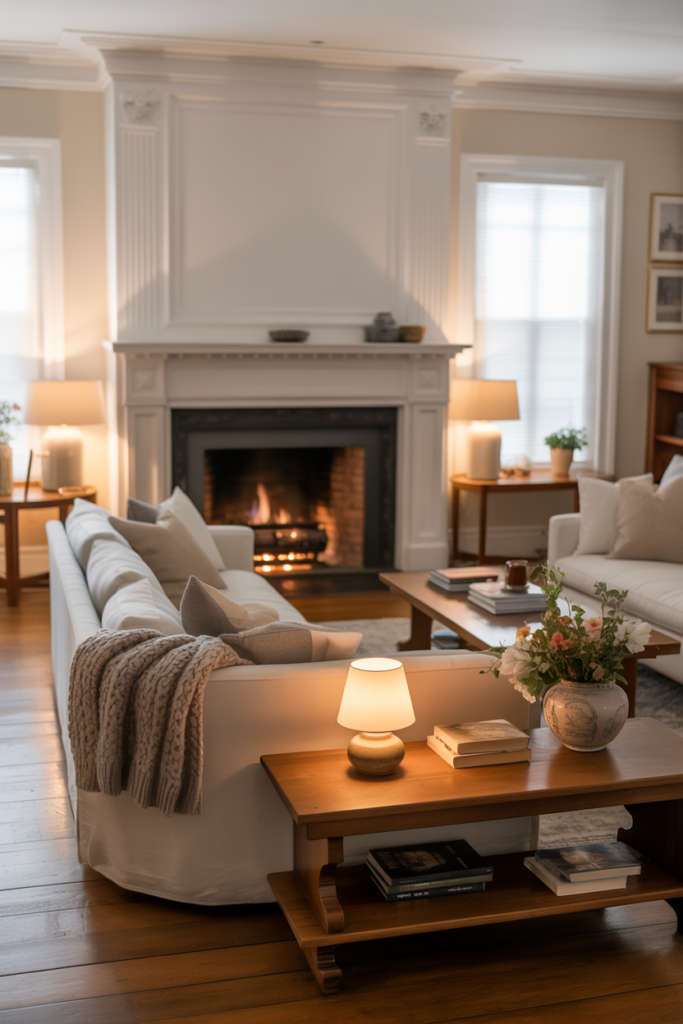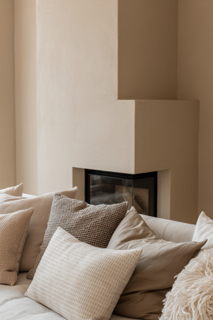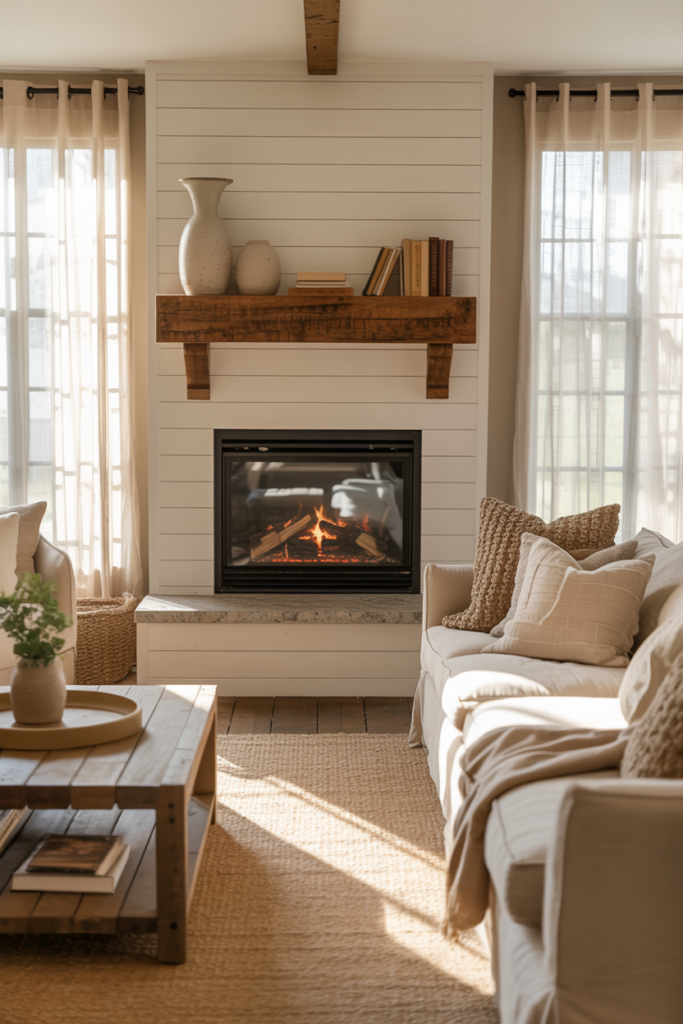 A minimalist mantel and soft beige walls set the mood just right. Adding a few leafy plants and textured pillows can bring it all together. This style is ideal for those who want a calm and uncluttered living room.