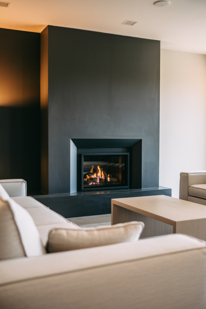 A dark fireplace with a charcoal accent wall can create a moody living room with depth and contrast. Lighter furniture and a vintage rug can set off the contrast in a sophisticated way. This style is perfect for those who want a modern and bold living room.