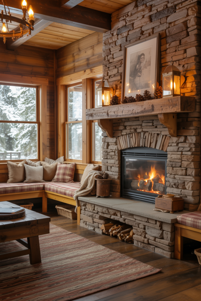A rustic, cabin-inspired corner fireplace can bring instant warmth to a living room. A white plaster surround keeps it light, while a reclaimed wood mantel delivers loads of character. Adding a built-in bench can create a snugly nook vibe.