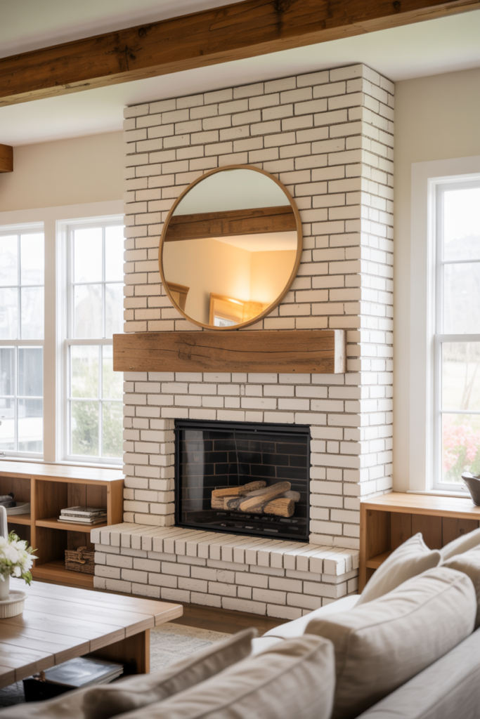 A white brick corner fireplace layered with natural wood accents and a big mirror above looks beautiful. Understated pottery and textured throws keep the look soft but still interesting. This style is perfect for those who want a fresh and airy living room.