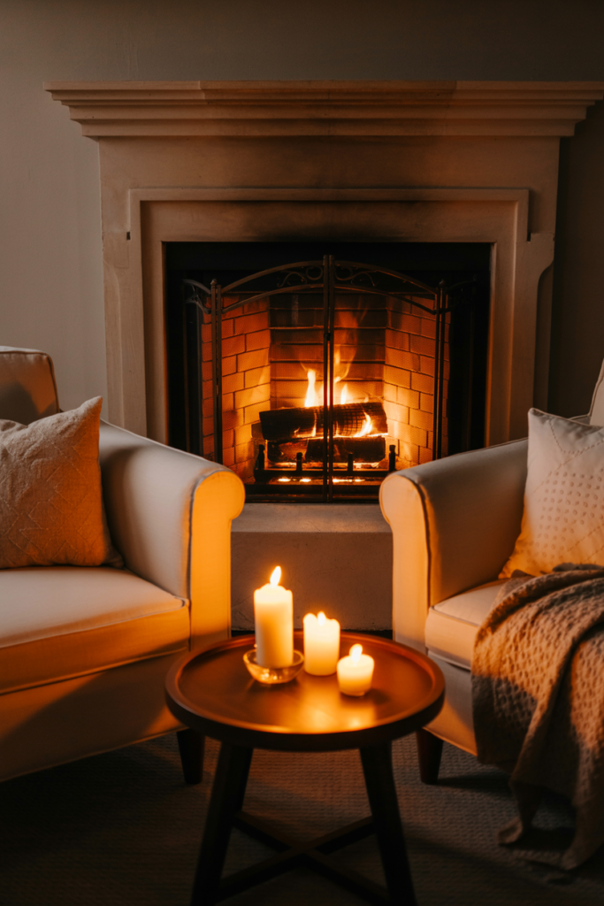 A corner fireplace can be used to create a sense of intimacy in a living room. Adding a few candles, a pair of comfortable chairs, and a small table can make the space feel cozy and inviting.