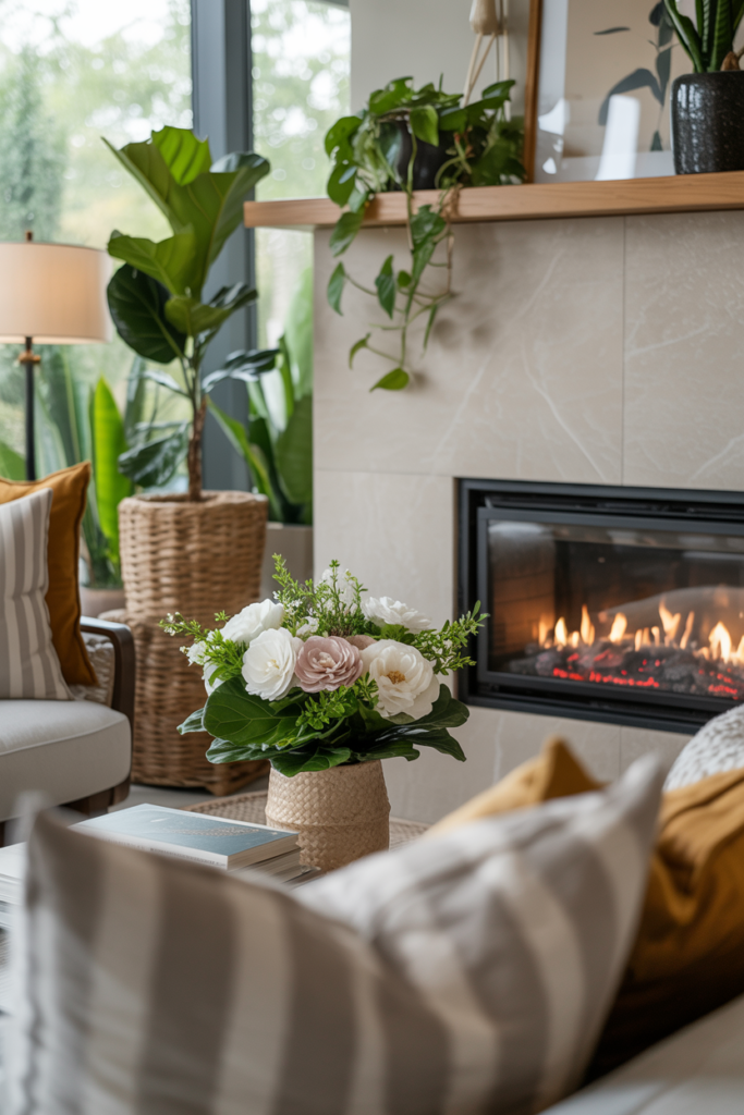Adding some greenery such as plants or a vase with fresh flowers can bring life to a corner fireplace. This style is perfect for those who want to add some natural beauty to their living room.