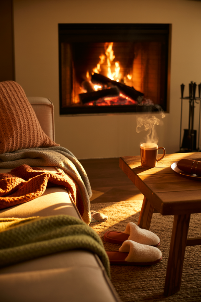 A corner fireplace can be used to bring warmth to a room. Adding a few throw blankets, a pair of slippers, and a warm beverage can make the space feel cozy and inviting.