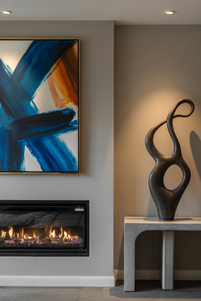 A corner fireplace can be used as a focal point in a living room. Adding a statement piece such as a large piece of art or a sculptural vase can draw the eye to the fireplace.