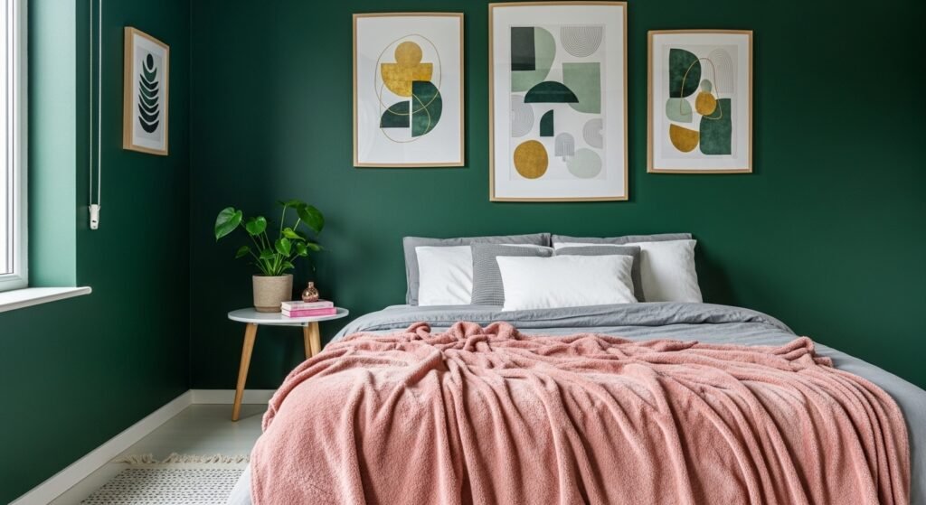Pops of blush or dusty rose bring out the richness in dark green, making the combo feel lively and fun but still sophisticated. Add a pink throw blanket or art for a fresh touch.
