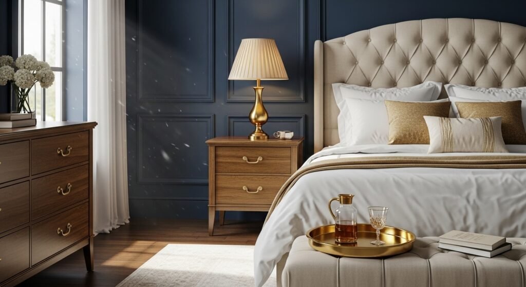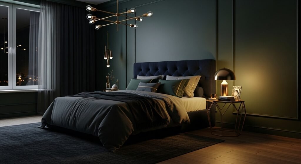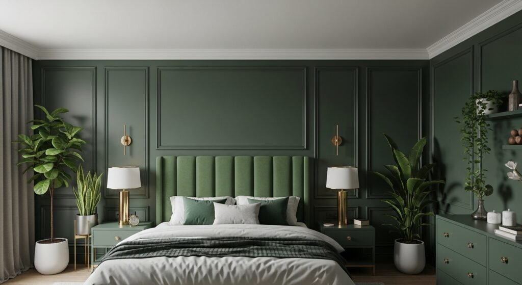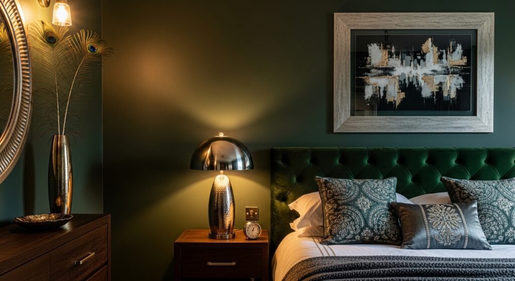 A single gold lamp, brass handles, or a shiny tray can make a dark green bedroom feel extra dreamy. Choose warm or antique gold finishes for a classic, non-blingy look.