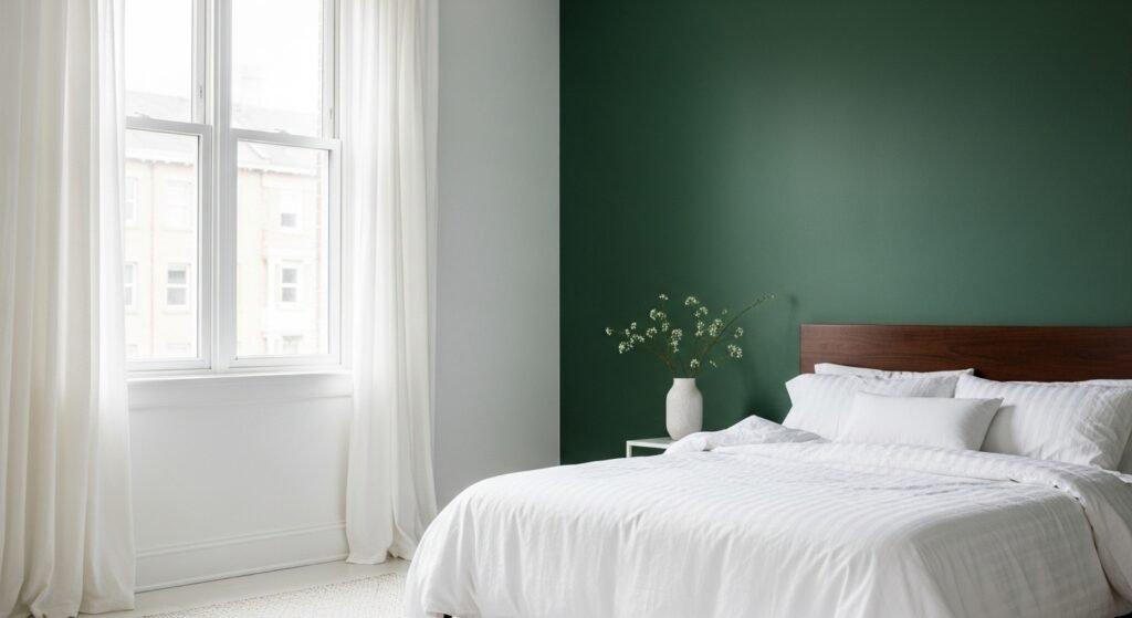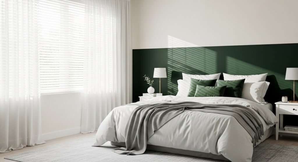 Balance dark green with lighter shades like white, cream, or pale gray to prevent the space from feeling too dark or overwhelming. Add sheer curtains or blinds for a bright, airy feel.