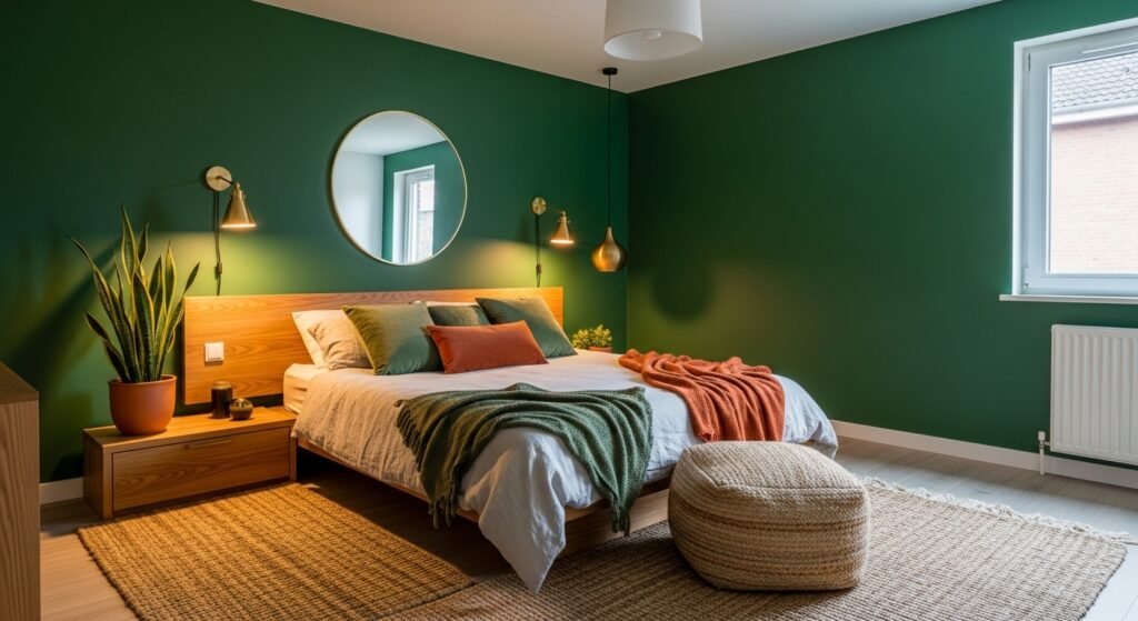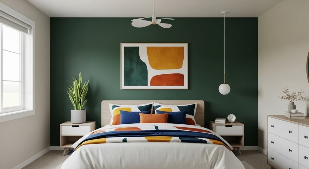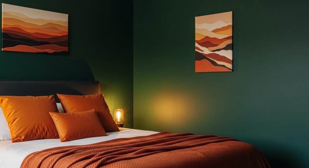 Create a focal point in a dark green bedroom with a statement piece like a bold piece of art, a colorful rug, or a unique lighting fixture.