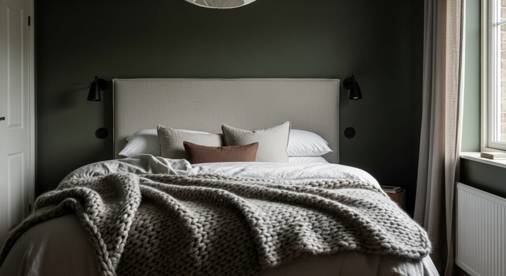 Natural textiles like linen, cotton, or wool can add a cozy feel to a dark green bedroom. Try a linen headboard, cotton bedding, or a wool throw blanket.
