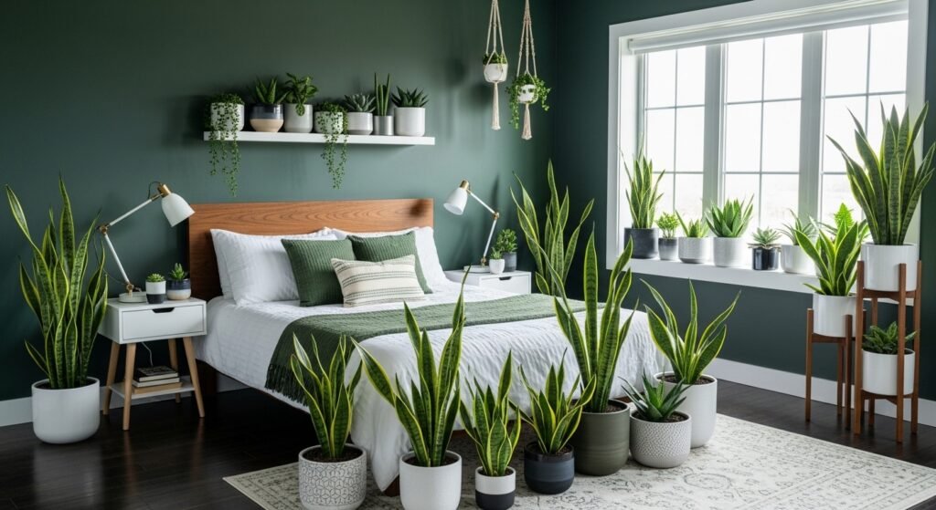 Plants can bring a touch of nature and lushness to a dark green bedroom. Choose low-maintenance plants like snake plants or succulents for a stylish, easy-to-care-for look.