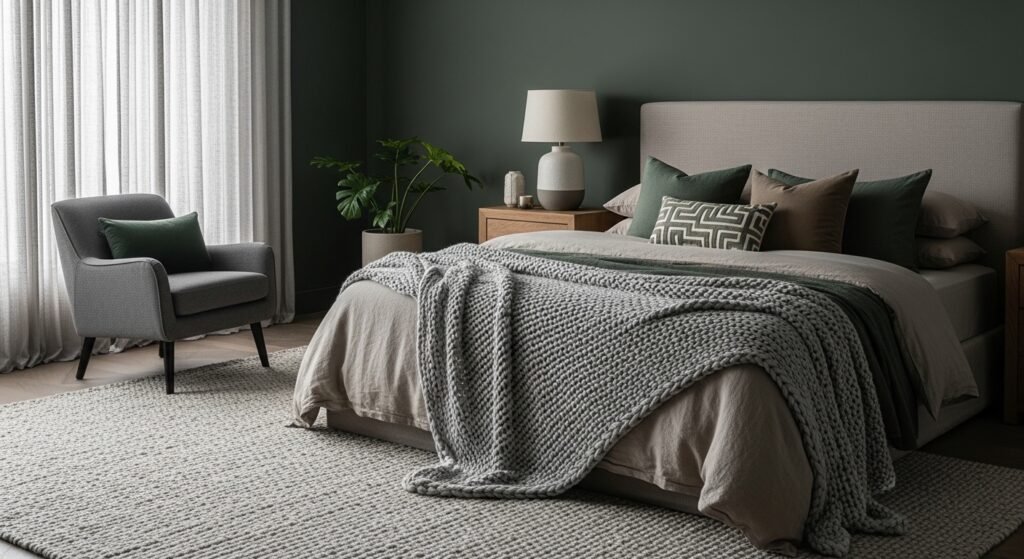 Mix dark green with neutral shades like beige, gray, or taupe for a balanced, calming atmosphere. Add textured elements like rugs or throw blankets for depth and interest.