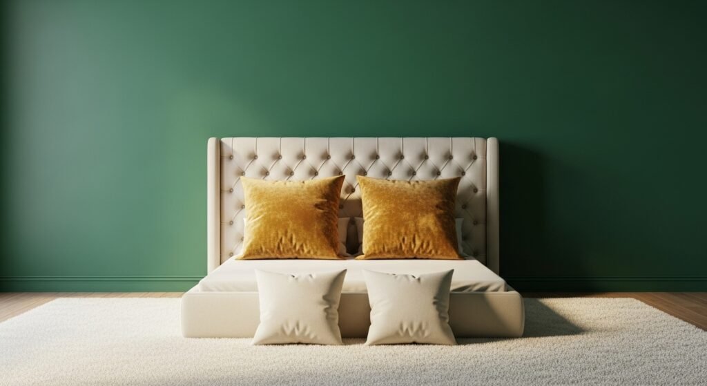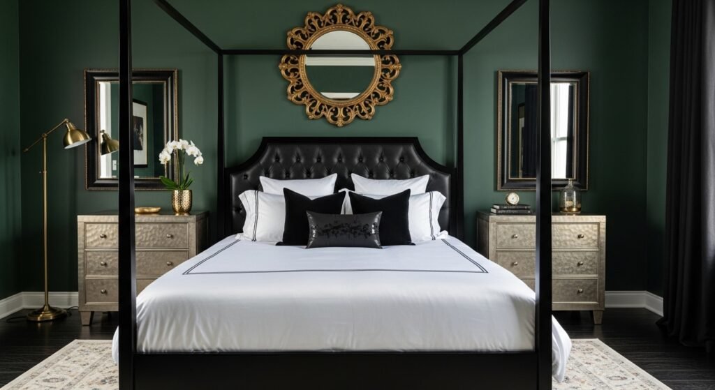 Sleek, saturated green walls set the scene, while textures like a tufted cream bed and gold velvet pillows bring a glam touch. Keep accessories minimal and layer on a soft rug for an inviting atmosphere.