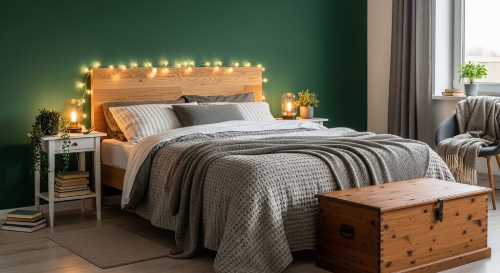 Paint an accent wall a moody green and bring in natural wood elements like bedside tables or frames. Add cozy textures like snuggly bedding and twinkly string lights for a lived-in feel.