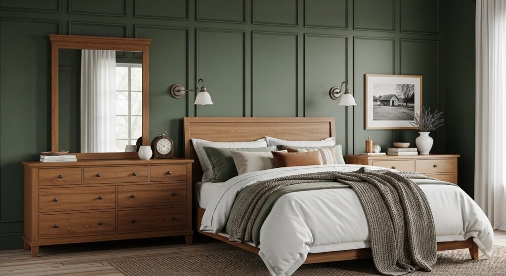 Paneled dark green walls channel classic architectural drama, while wood furniture and vintage-inspired lighting add a timeworn, heritage look. Complete with layered bedding and meaningful objects for an elegant farmhouse mood.