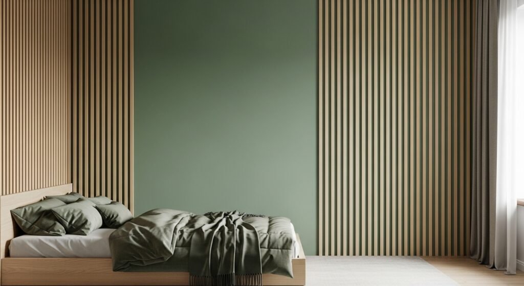 A sage green wall brings calm energy, while wooden slats add dimension and subtle texture. Pair with a low platform bed and olive and sage covers for a modern, layered feel.