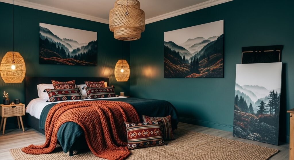 Teal-leaning dark green walls and natural rattan lighting create drama, while landscape-inspired artwork adds soul. Mix with woven textures and deep color for a cozy, inviting atmosphere.