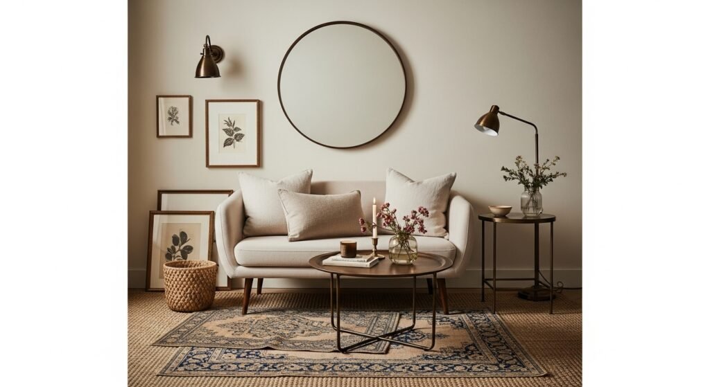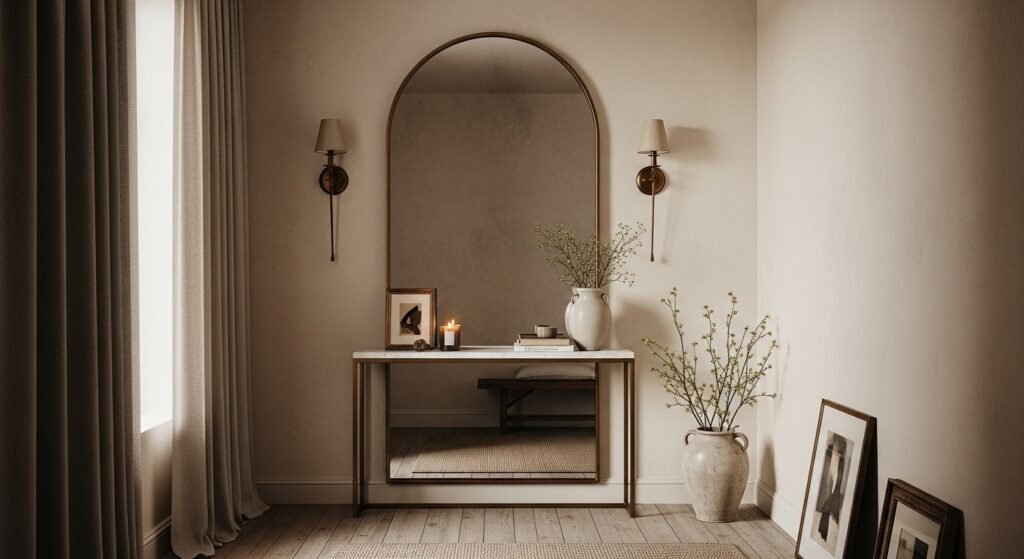 Mirrors are the oldest trick in the interior design book for a reason: they instantly double the perceived size of any room. By placing a large floor-to-ceiling mirror opposite a window, you reflect natural light deeper into the space, making it feel brighter and more expansive. Mirrors break up the solidity of walls and create a ‘window’ effect that tricks the brain into seeing depth where there is none. For the best results, choose a thin, minimalist frame or a frameless design to maintain a contemporary look. This strategy works exceptionally well in narrow hallways or small dining alcoves where light might otherwise be limited, providing a sophisticated and functional decorative element.