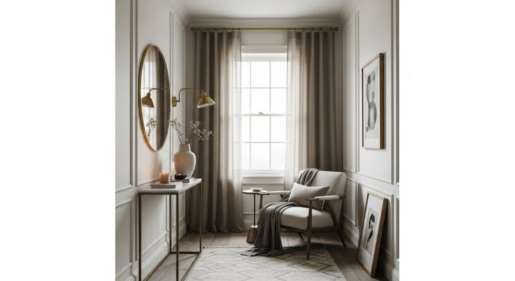 A common mistake in small rooms is hanging curtain rods directly above the window frame. To make your ceilings look taller and your windows look larger, mount your curtain rods just below the ceiling line and extend them several inches past the window’s width. This allows the fabric to frame the window without blocking the glass, maximizing the amount of natural light entering the room. Long, flowing drapes that touch the floor create a strong vertical line that draws the eye upward, giving the illusion of a grander space. Opt for sheer fabrics to keep the light soft and airy, or match the curtain color to the walls for a seamless, expansive aesthetic.