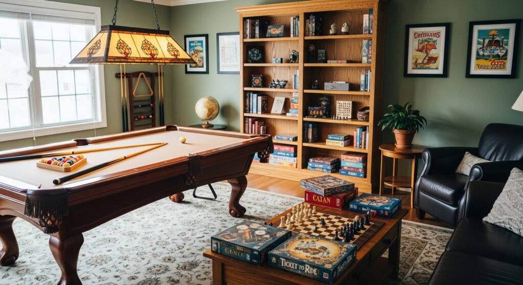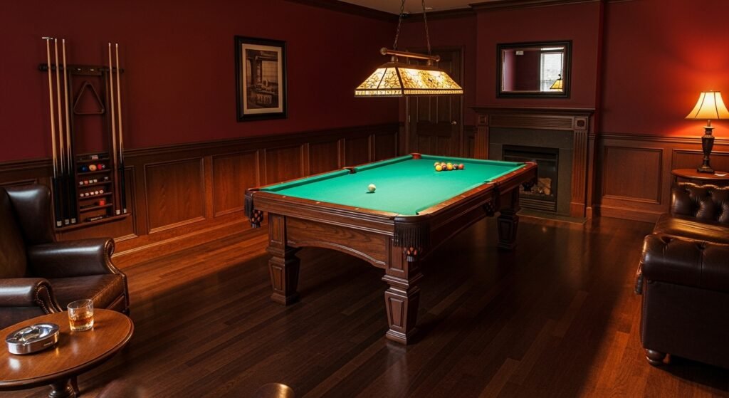A pool table lounge is a classic idea for a man cave. Create a space that feels like a real pool hall, with a pool table, dark wood finishes, and warm lighting. Add some retro touches, like a jukebox or leather sofas, to create a space that feels relaxed and fun.