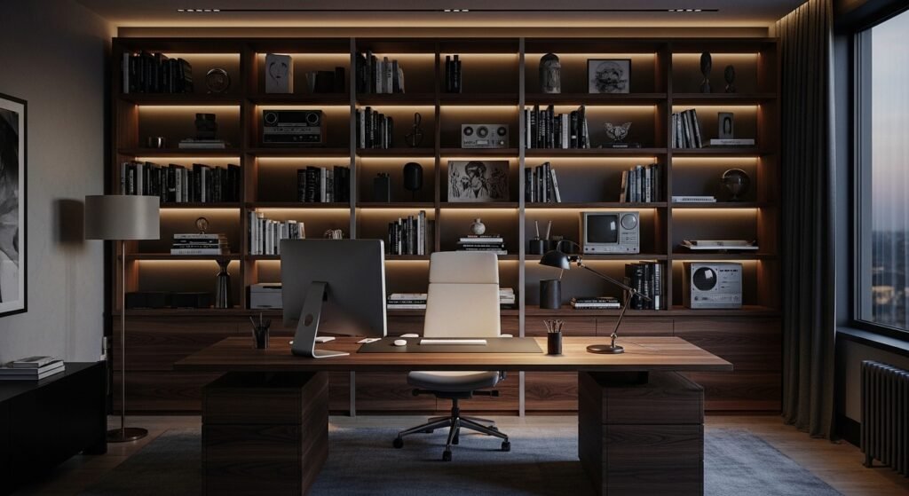 A sophisticated work cave is a must-have for any man who works from home. Create a space that feels sharp and grounded, with dark shelving, sculptural decor, and a bold wood desk. Add some natural light and a comfortable chair to create a space that feels focused and productive.