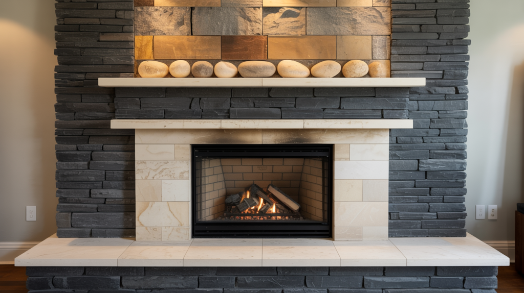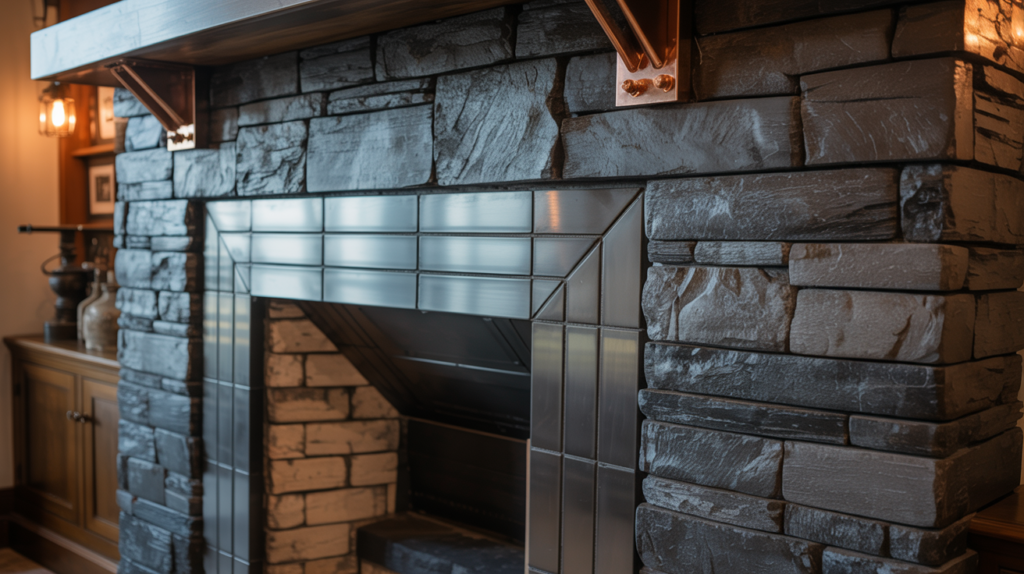 A stone fireplace paired with metal accents can create a unique and interesting look. Try using metal tiles or a metal surround to add some industrial chic to your space.