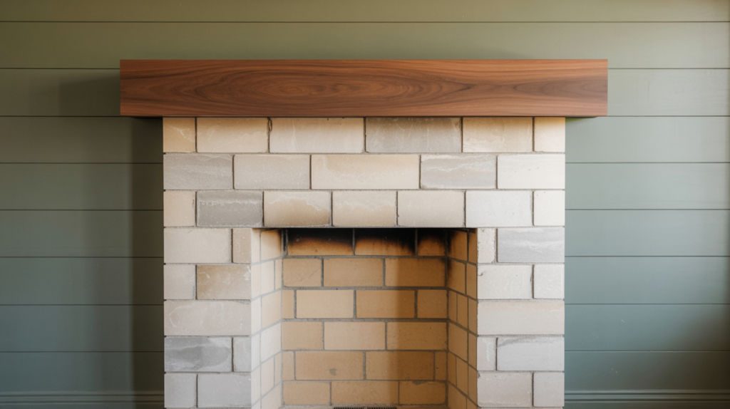 Compact limestone block fireplace set into muted sage shiplap wall with walnut mantel and a bench hearth extension.