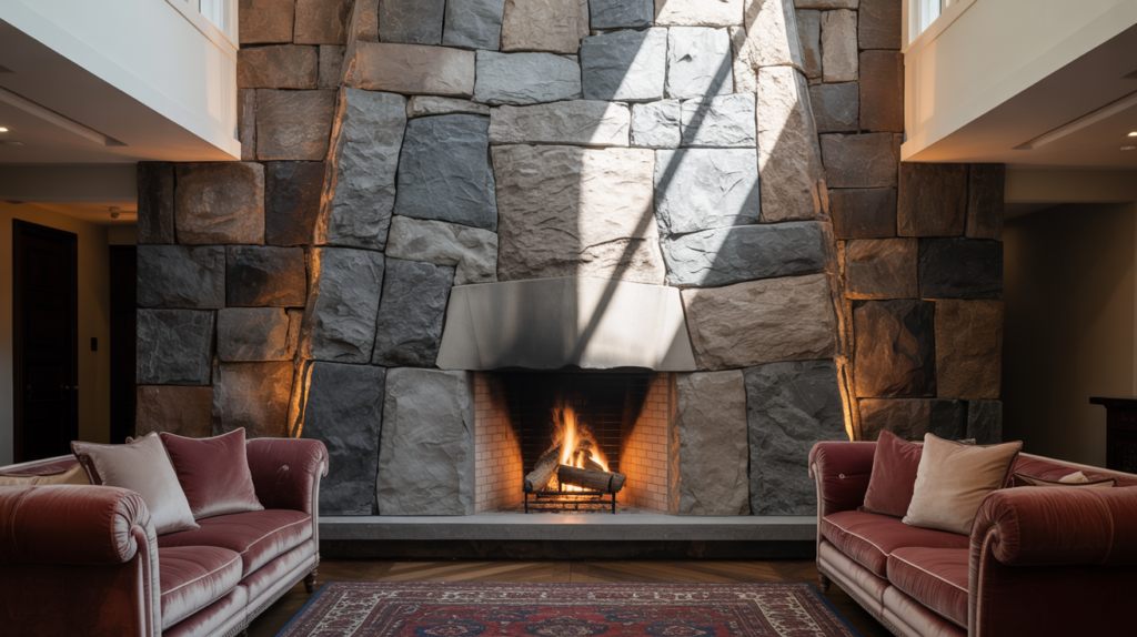 When you want your living room to have that jaw-dropping moment, a floor-to-ceiling stone fireplace brings it. The vertical stretch pulls your eye all the way up, making ceilings look higher and rooms feel airier.