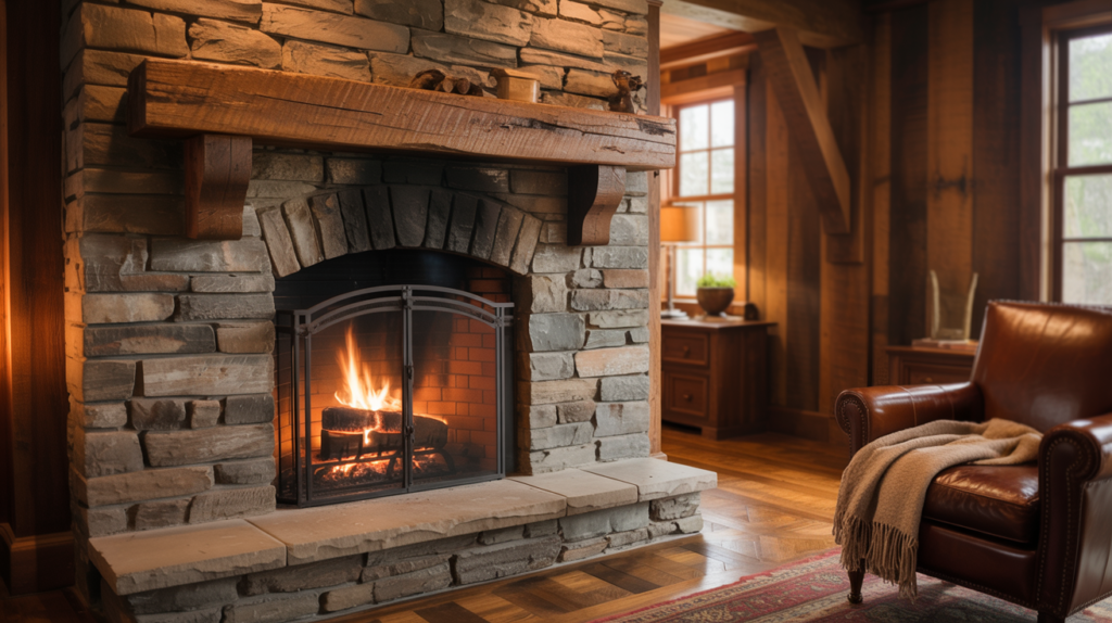 A stone fireplace paired with wood accents can create a rustic and cozy look. Try using reclaimed wood for the mantel or surround to add some warmth and character.