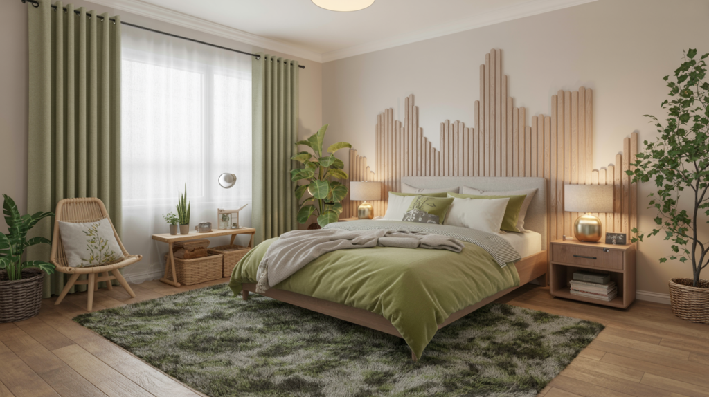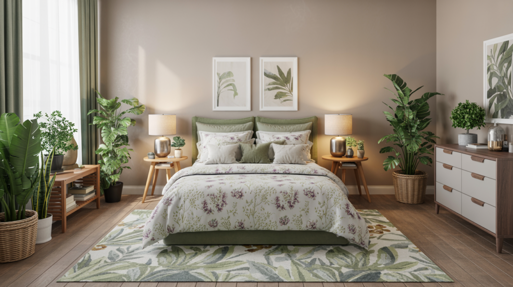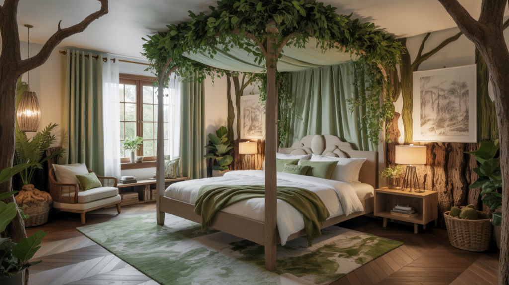 Bring the outdoors in by incorporating deep greens, natural wood, and leafy prints into your bedroom design. This look works best when paired with plenty of natural light or a cozy, earthy feel. Consider adding a canopy bed with gauzy curtains for extra softness, and don’t forget to incorporate woven baskets or wooden side tables to tie the look together.