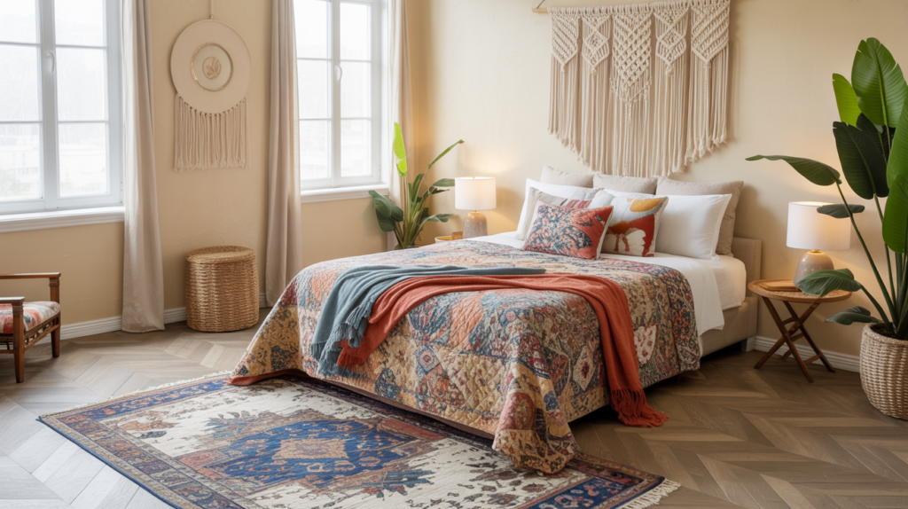Layer woven textures and patterned fabrics to create a look that feels collected and personal. This approach is perfect for those who want to achieve a carefree, bohemian vibe without sacrificing style. Mix in some macrame art, string lights, and natural fibers to bring in that easygoing, bohemian charm.