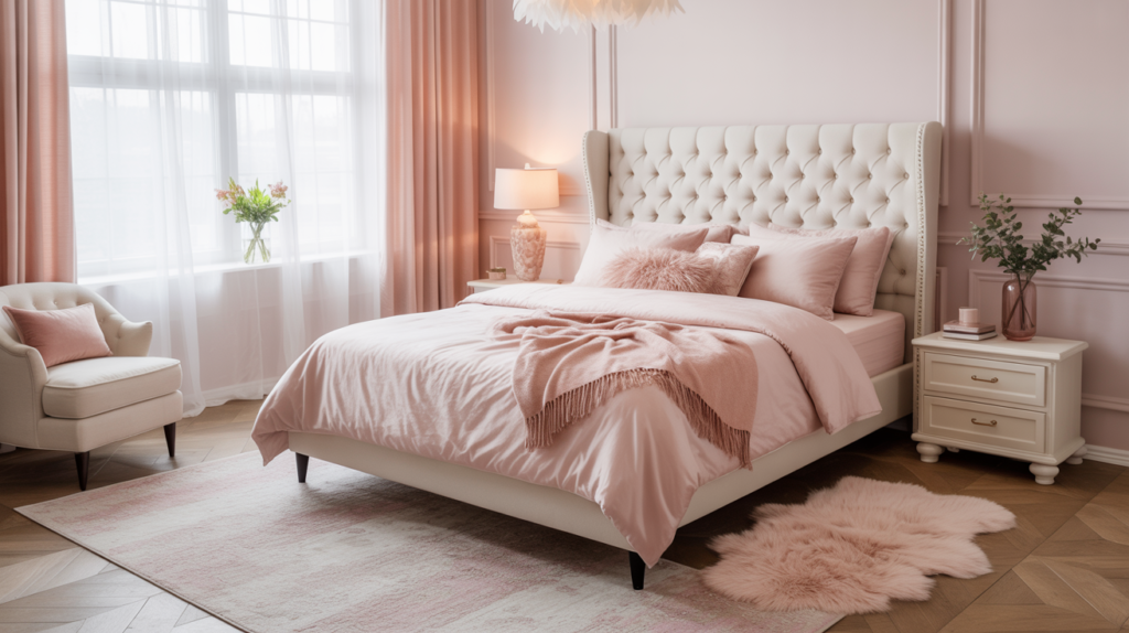 Blush tones paired with gold details are perfect for small bedrooms that need a touch of warmth and glamour. Tufted headboards, flowing curtains, and soft lighting can make the space feel elegant yet approachable. Don’t forget to add some floral accents or greenery to soften the look and create a cozy atmosphere.