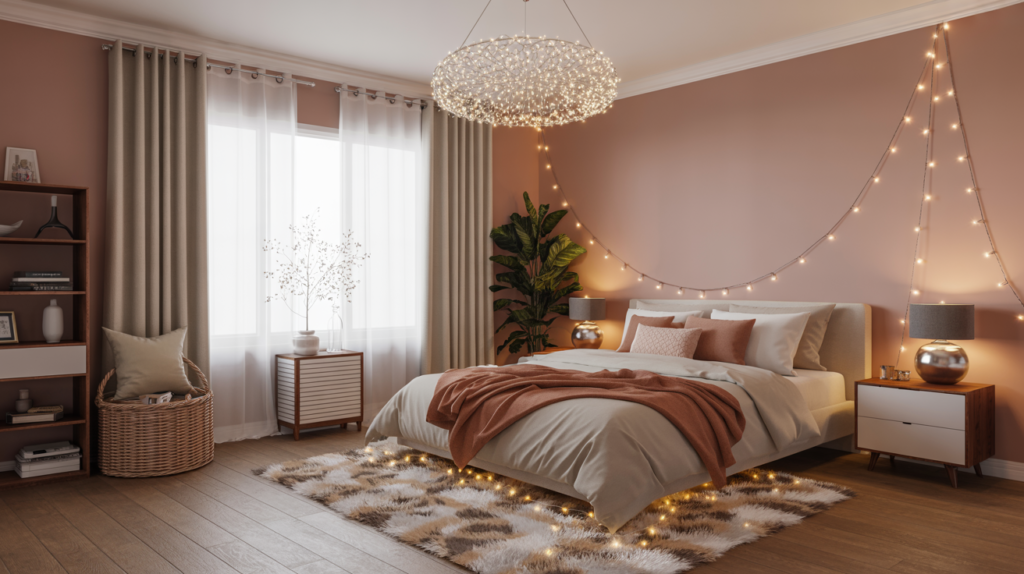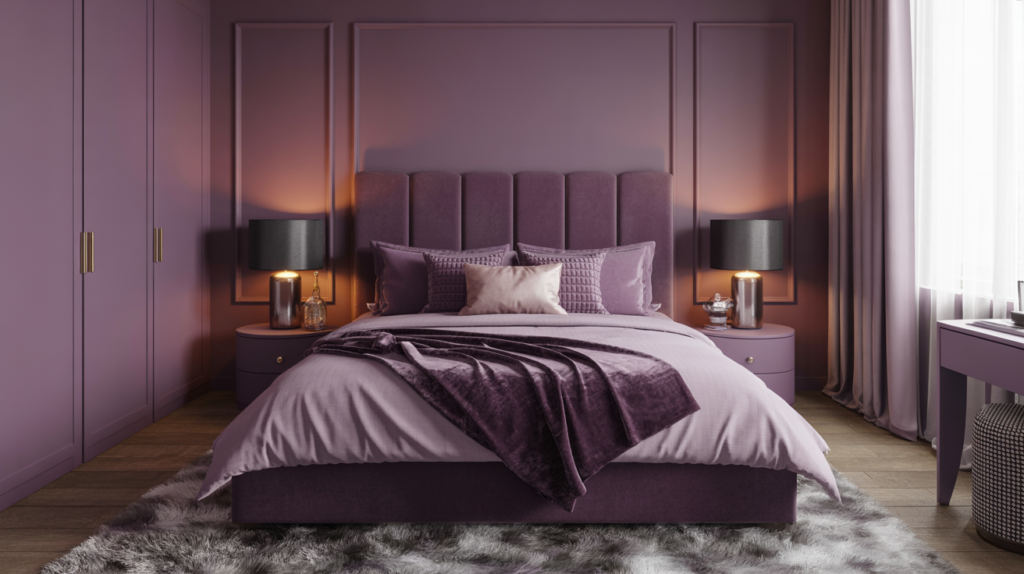 Lavender, plum, and deep violet tones can bring a sense of wonder to your bedroom. Twinkle lights and glowing accents can enhance the dreamlike feel, while mixing rich purples with hints of silver or gold can keep the palette from feeling flat. Consider adding a statement headboard or canopy to anchor the look and create a sense of structure.