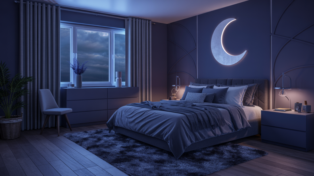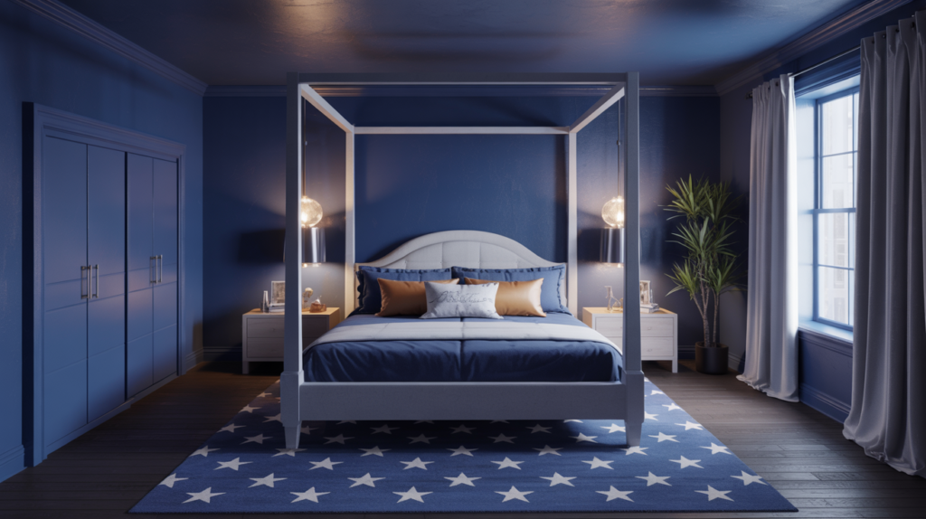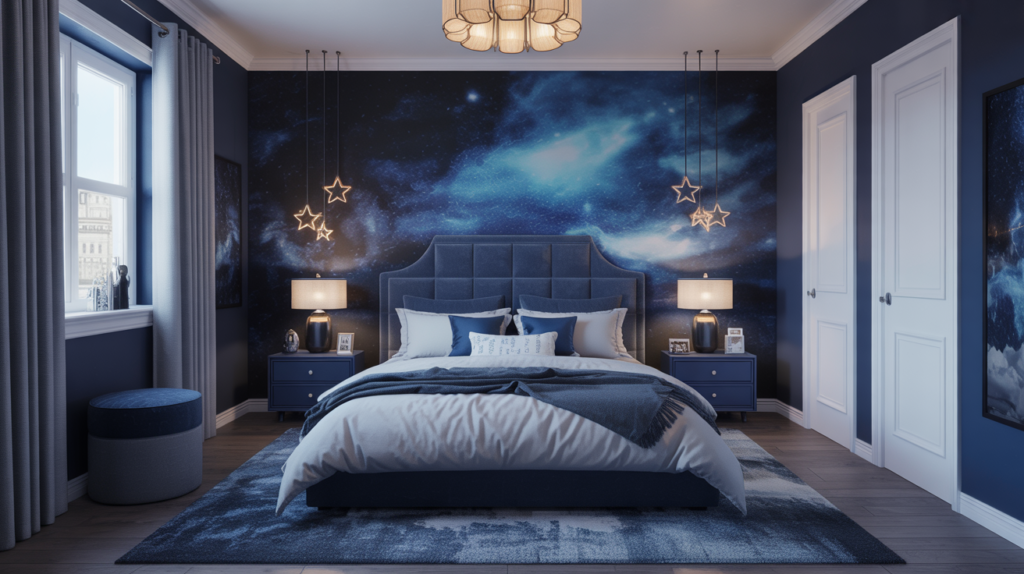 Deep blue tones can set a dramatic backdrop for a cozy and bold bedroom. Layering subtle string lights can add balance to the look, while accents in velvet, metallic finishes, or jewel colors can play beautifully against the darker walls. Consider adding a star-print throw or patterned rug to add a touch of whimsy to the space.