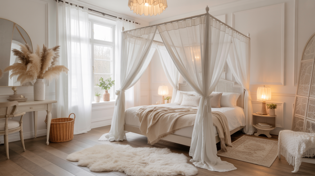 Create a sense of romance and whimsy with a dreamy canopy bed. Use flowing fabrics, like silk or cotton, to create a sense of drama and luxury. Consider adding some comfortable and cozy bedding, like a plush duvet or soft blankets, to create a sense of warmth and relaxation.