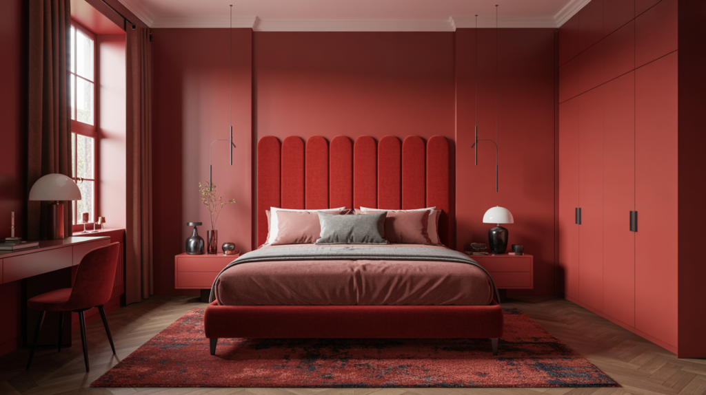 Deep crimson tones in bedding or drapery can instantly set a dramatic mood. Velvet textures can heighten the richness, while floral pillows or layered fabrics can keep the space balanced. Consider adding some hanging greenery or potted plants to give a fresh counterpoint to the intensity of red and create a moody yet romantic atmosphere.