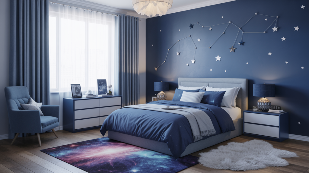 Create a magical and dreamy atmosphere with a starry night sky-inspired bedroom. Use dark blues and grays to create a sense of depth, and add some twinkle lights or glow-in-the-dark stars to mimic the night sky. Consider adding some comfortable and cozy bedding, like a plush duvet or soft blankets, to create a sense of warmth and relaxation.