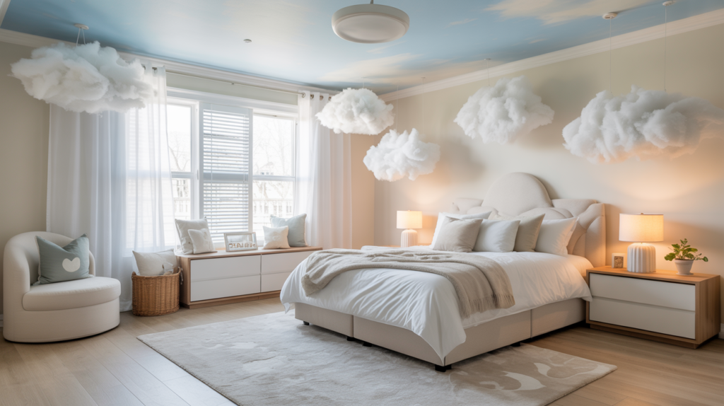 Layer whites and creams to mimic the feeling of floating, and add some extra-soft fabrics like faux fur or plush rugs to keep it cozy. Sheer curtains can let natural light filter through beautifully, while a rounded headboard or circular mirror can add softness to the look. Don’t forget to incorporate some texture to give the space depth and create a light, calm, and dreamy atmosphere.