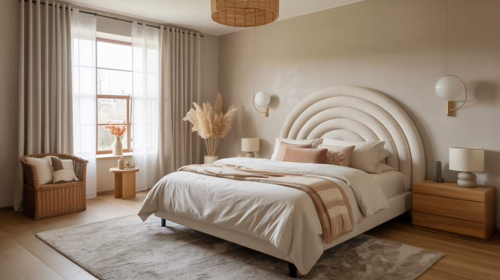 Curved walls and warm neutrals can wrap you in a sense of calm, while clay-inspired tones paired with natural wood details can make the room feel grounded and soothing. Soft lighting woven into architectural lines can create a glowing effect that feels protective and serene, making this look perfect for those who want a minimal yet textured space.