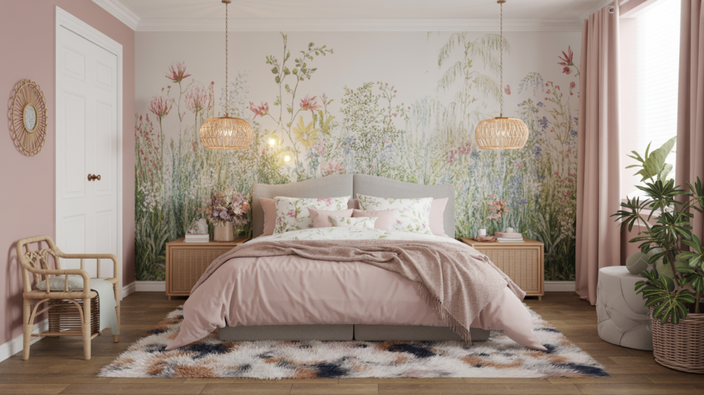 Transform your bedroom into a secret garden with floral prints, leafy greens, and soft bedding. This look is perfect for creating a fresh and inviting atmosphere without feeling too feminine. Consider adding botanical artwork, trailing vines, and delicate lighting to complete the garden-inspired look.