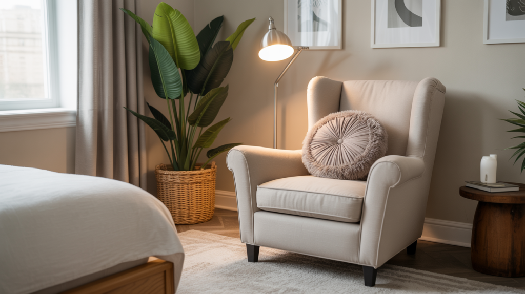 Create a cozy and inviting reading nook with a comfortable chair, a side table, and a good reading light. Consider adding some soft and cozy textiles, like a throw blanket or a plush rug, to create a sense of warmth and relaxation. Don’t forget to incorporate some natural elements, like plants or flowers, to bring in a sense of calm and serenity.