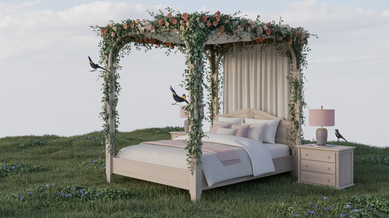 Create a sense of romance and whimsy with a dreamy canopy bed. Use flowing fabrics, like silk or cotton, to create a sense of drama and luxury. Consider adding some comfortable and cozy bedding, like a plush duvet or soft blankets, to create a sense of warmth and relaxation.