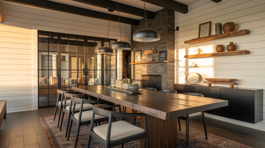 Layering dark wood finishes with matte black accents creates a modern farmhouse dining room that feels both inviting and dramatic.