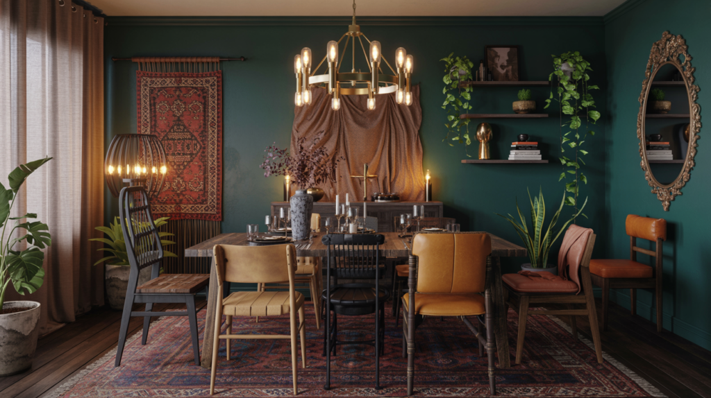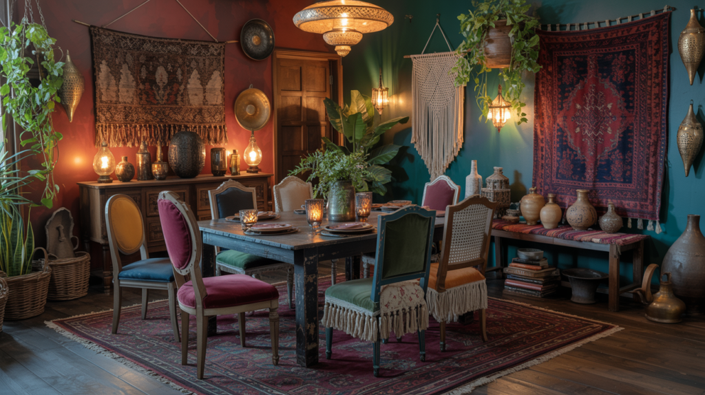A dark boho dining room is all about texture and laid-back style. Use darker tones for rugs, throws, or macrame wall hangings.