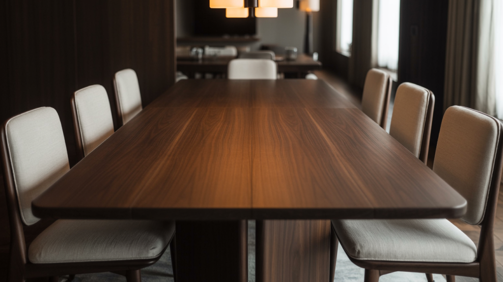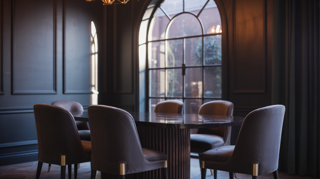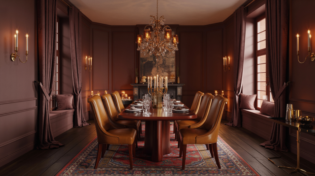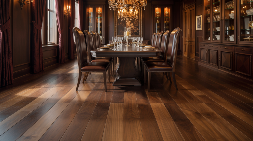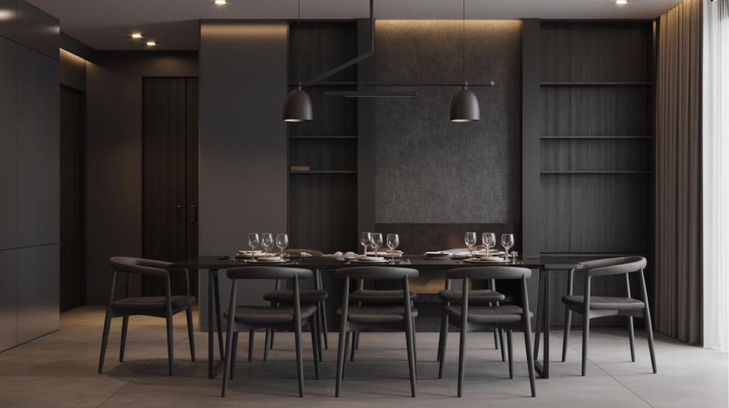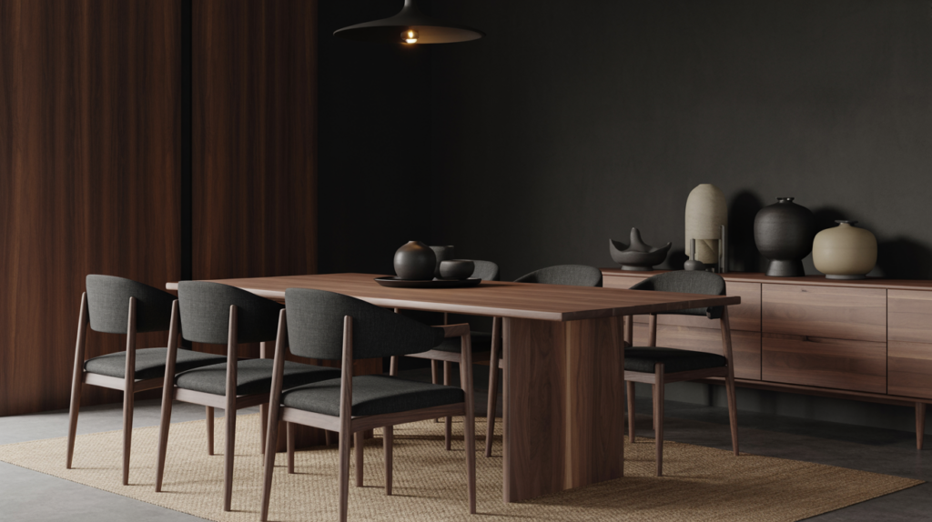 Using dark wood throughout your dining room brings instant richness and depth. Walnut, espresso, or even black oak all work beautifully for the table, chairs, and flooring.
