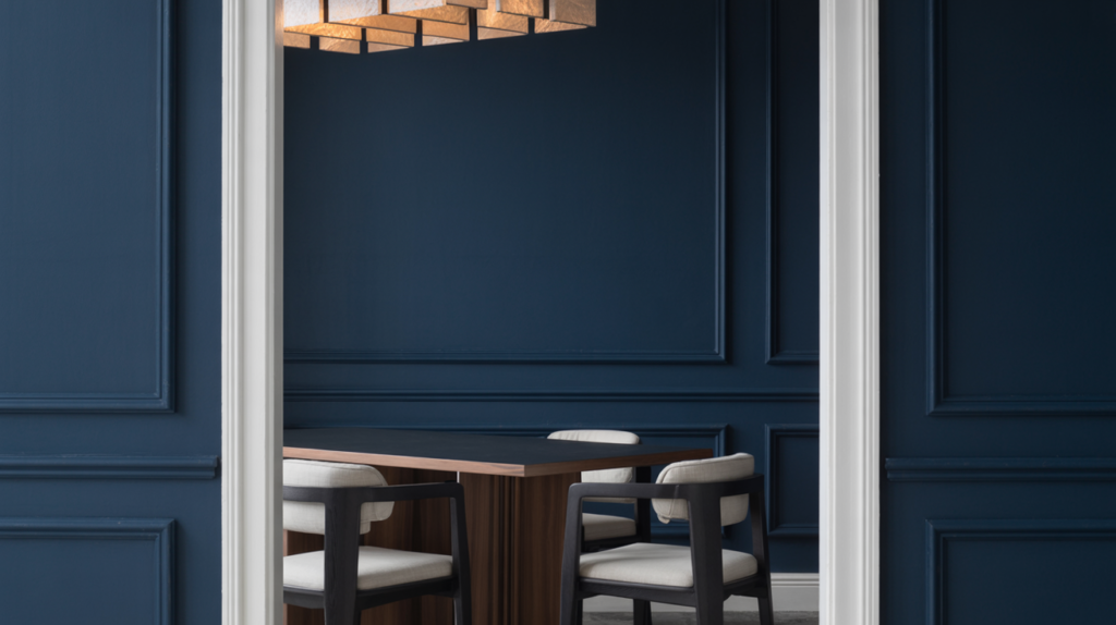 Navy or midnight blue walls are a bold but safe way to add depth. These shades pair well with both modern and traditional styles. Go tonal with matching trim or introduce contrast using white crown molding.