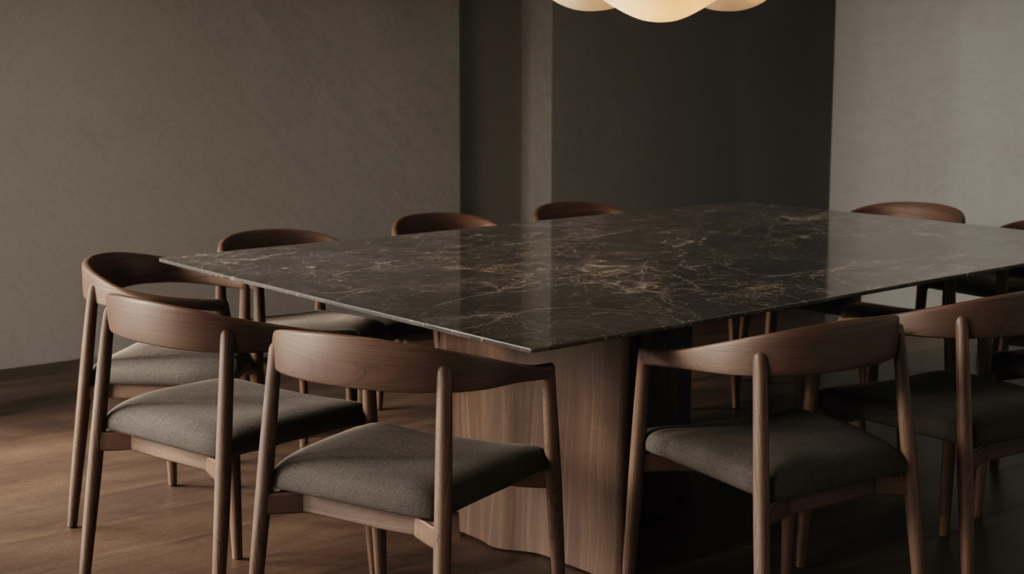 A dark marble dining table commands attention. Use black, deep gray, or green marble with natural veining. Keep the rest of the room simple and let the table shine.
