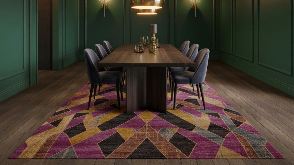 A statement rug can add texture and visual interest to your moody dining room. Choose a rug in a deep, rich color that complements the room’s colors and adds to its cozy atmosphere.