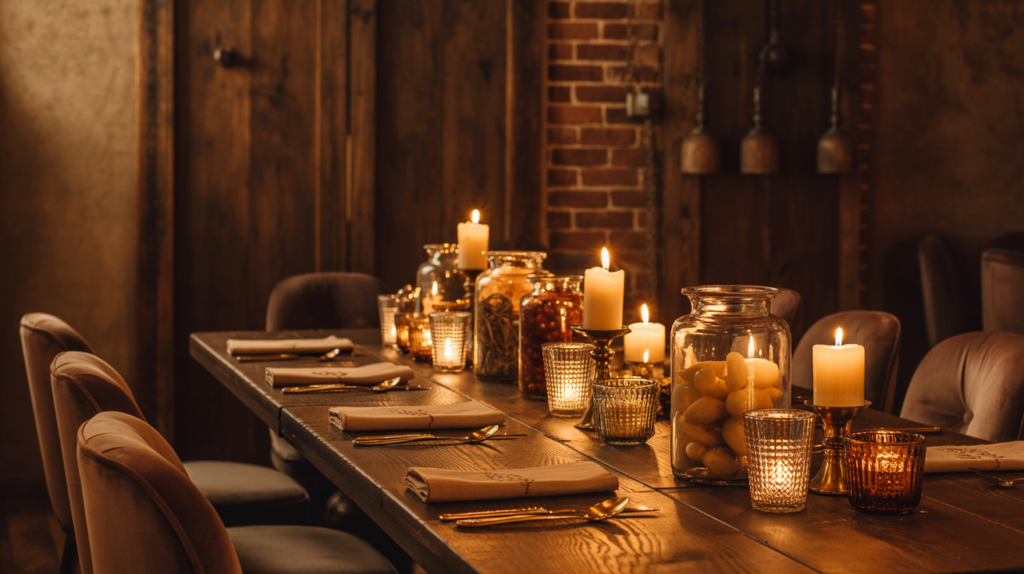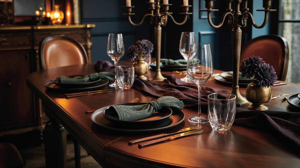 Continue the moody theme in your table setting by using a color palette that complements the room’s colors. Choose dishes, glasses, and linens in deep, rich colors to add to the room’s drama.