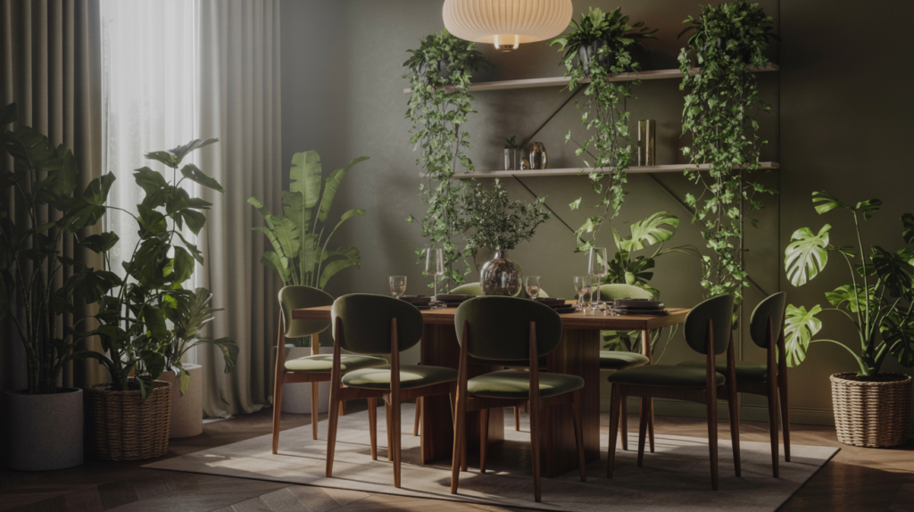 Adding plants to your moody dining room can bring in a touch of nature and soften the space. Choose plants with deep green leaves to complement the moody colors.